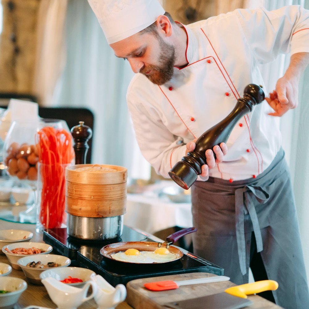 - Zubereitung und Service individueller Frühstücks-Gerichte (z.B. Rührei, Speck und Spiegelei)